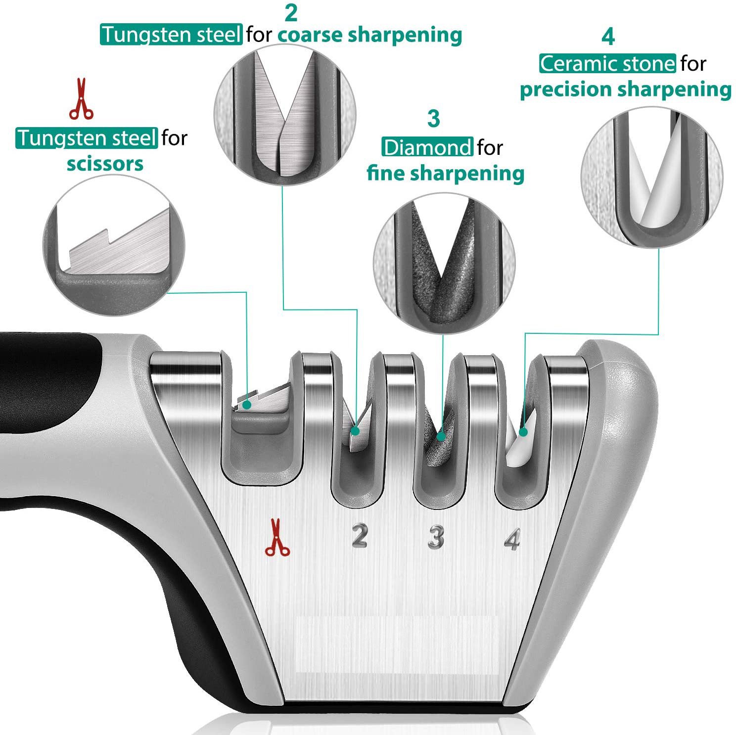 Tungsten steel specifically designed to sharpen scissorsTungsten steel for coarse sharpeningDiamond for fine sharpeningCeramic stone for precision sharpening