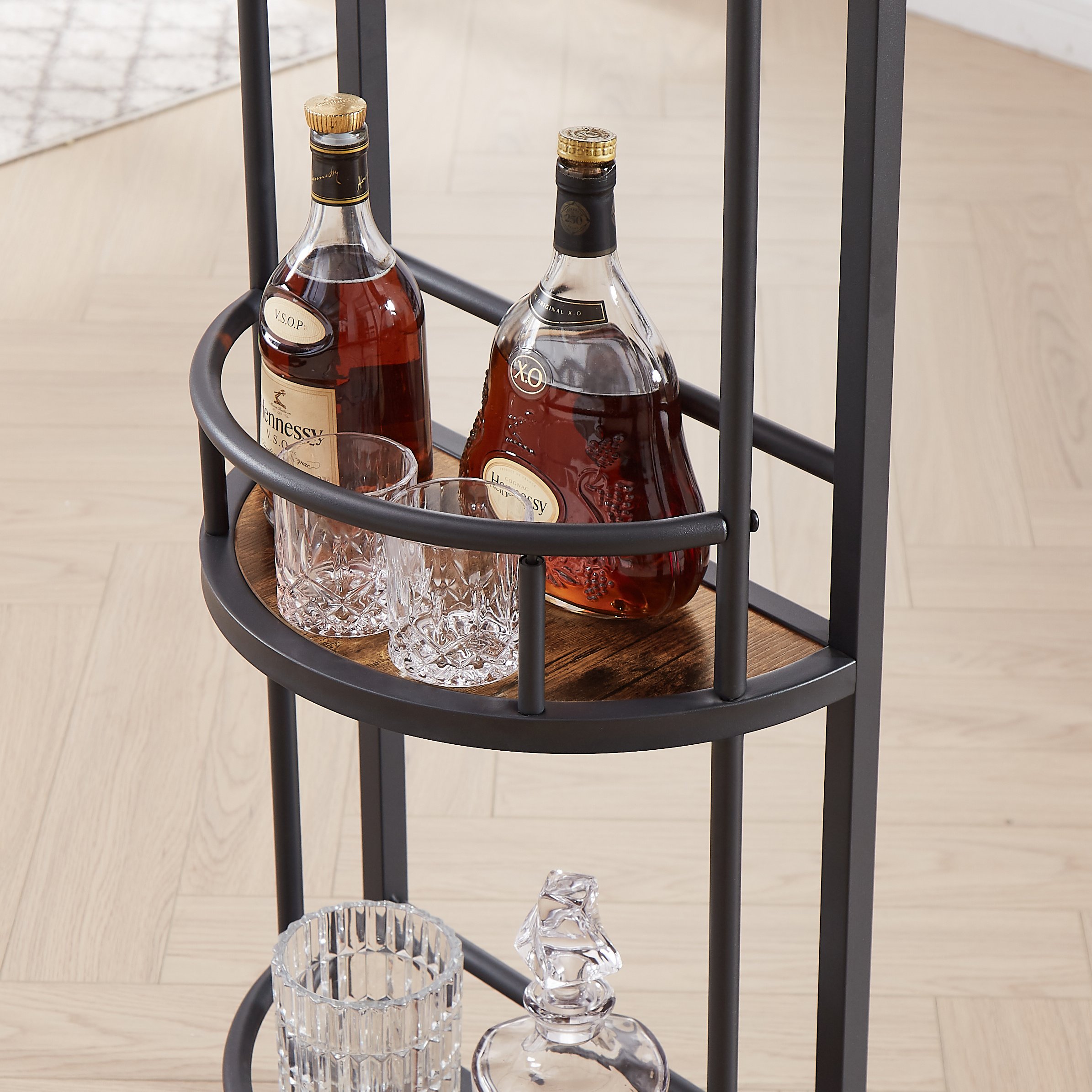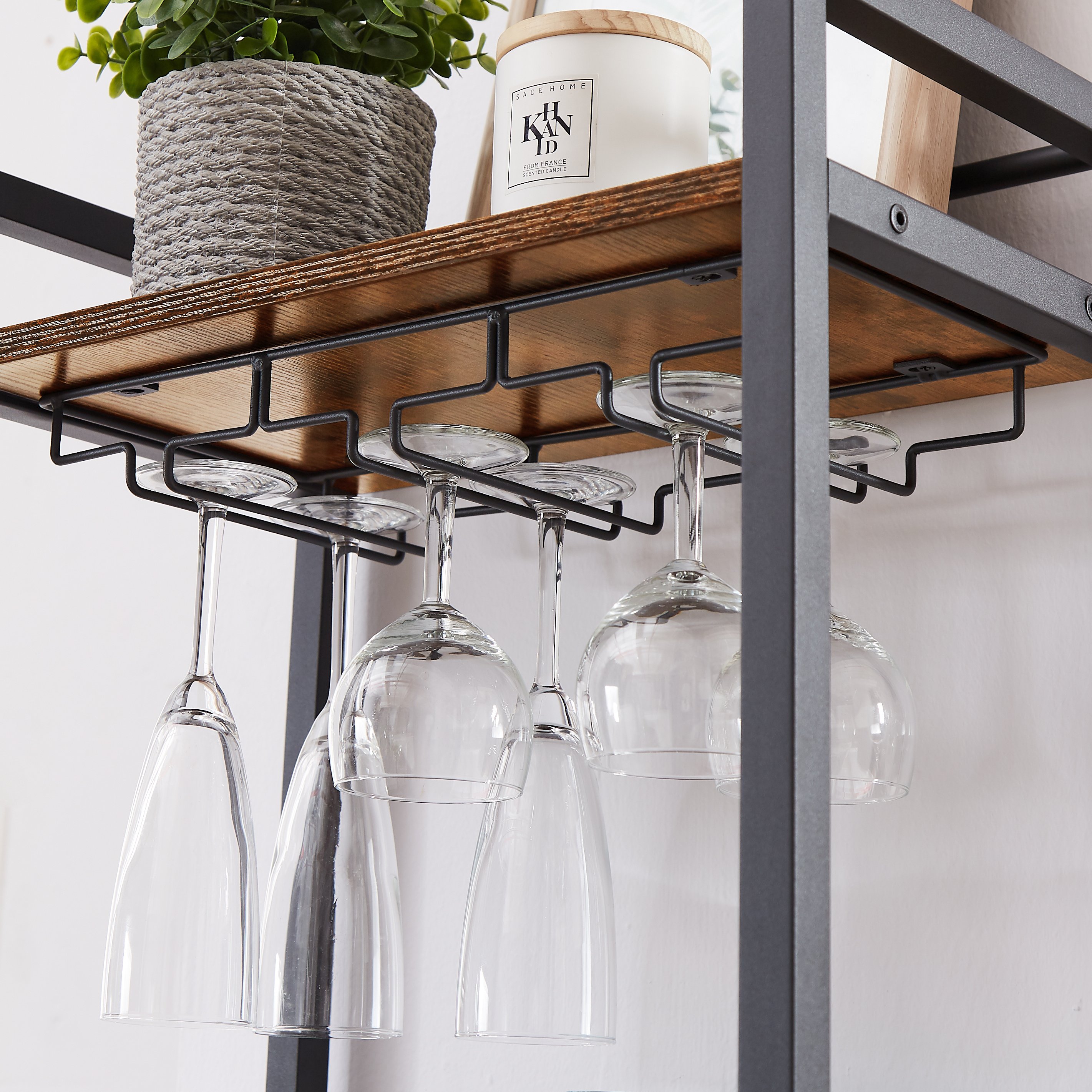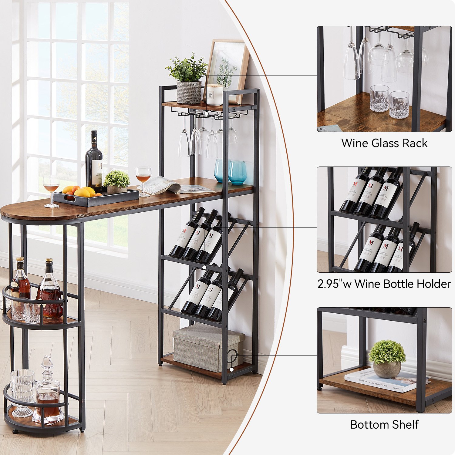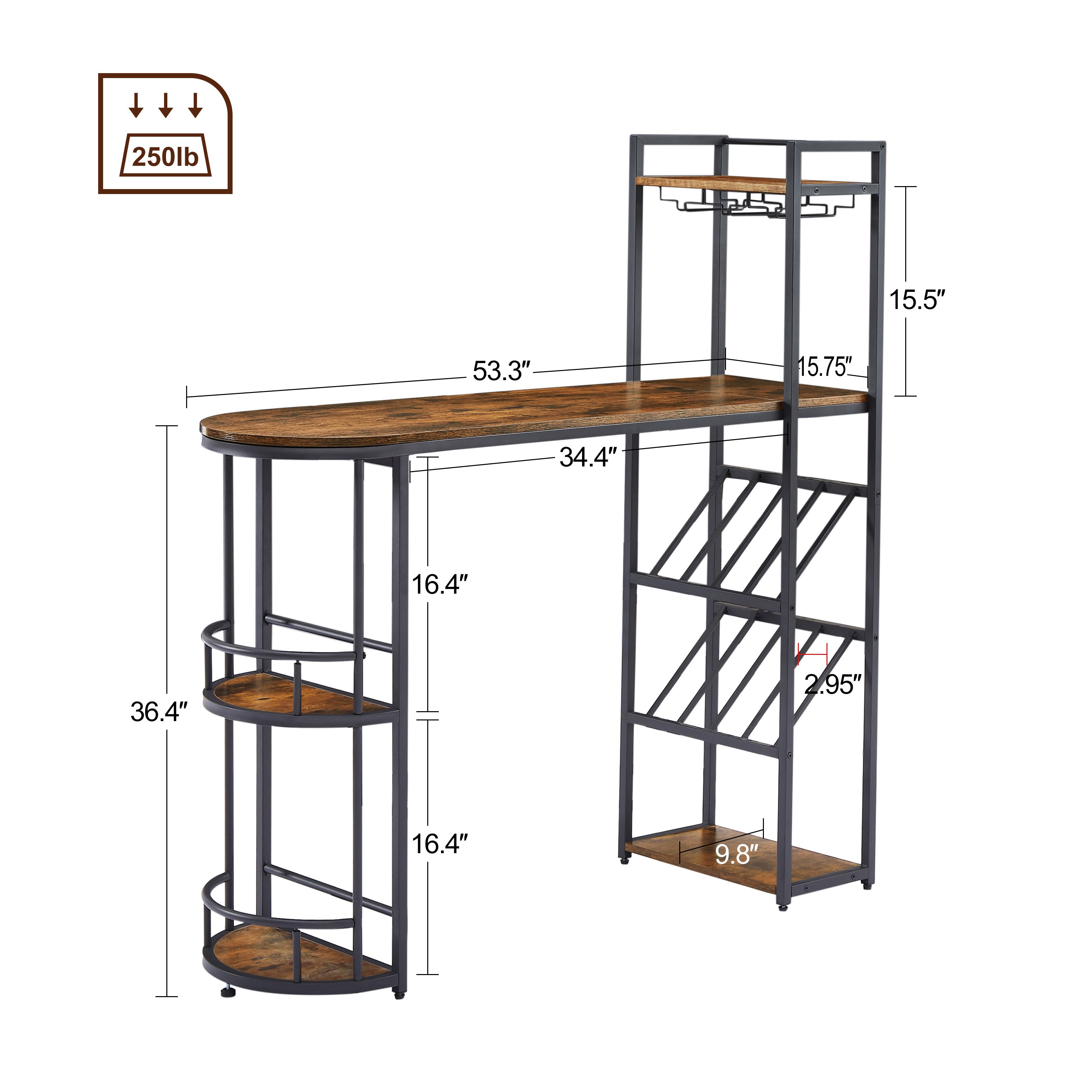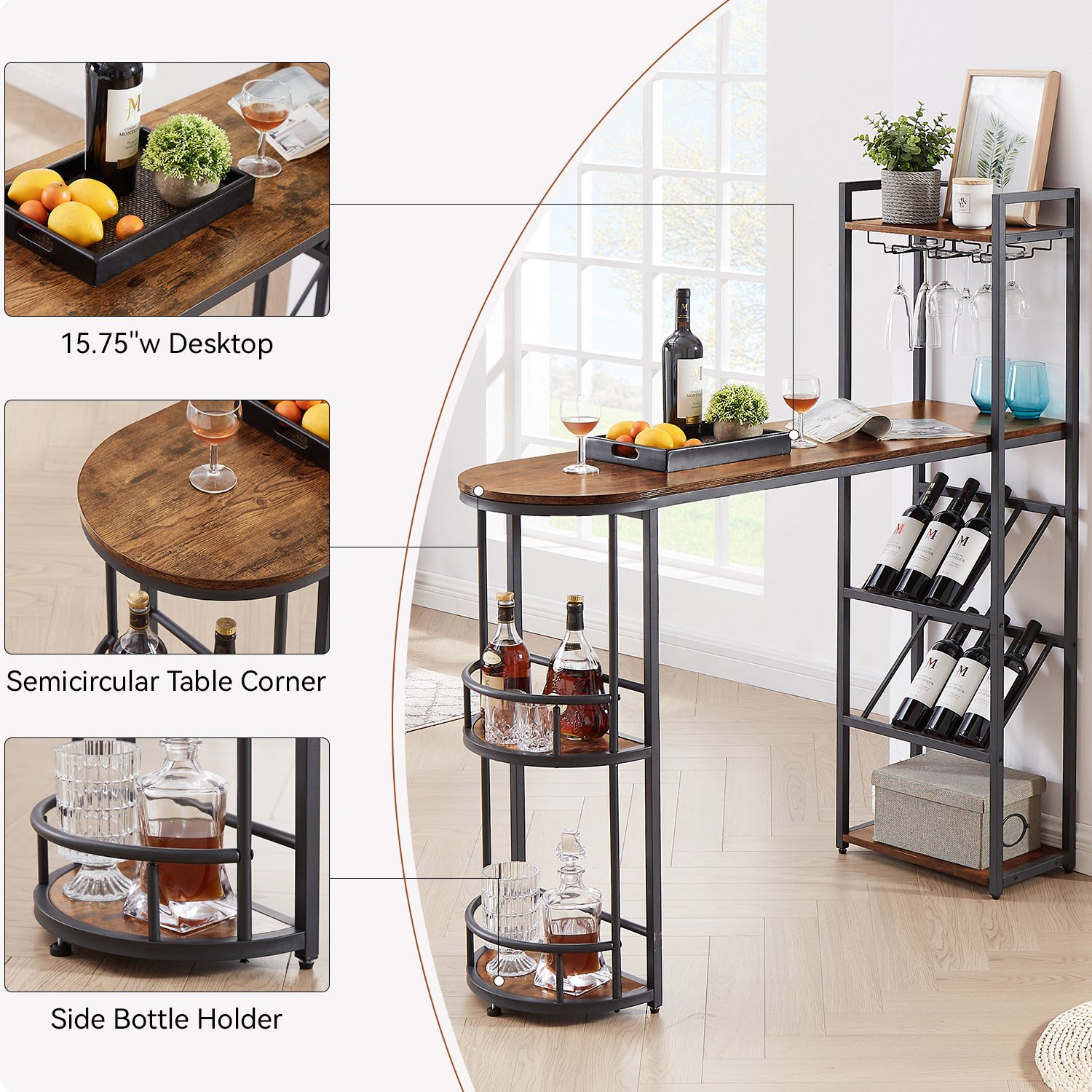 Bar table with bottle holder and glass holder; multifunctional high bar table; can hold 8 bottles of wine and 9 glasses; with side storage.(Rustic Brown; 53.3''w x 15.75''d x 36.4''h)Package Contents1 x Bar Table1 x Assembly Kit1 x InstructionsProduct Description•Multifunctional bar table; this table provides you with an excellent dining or drinking place; you can use it for a drink; breakfast and afternoon tea.• This bar table features bottle holders; glass holders and side organizers; so you can keep your favorite beverages on the 8 bottle holders and keep everything organized.•The side storage table perfectly meets the daily storage needs; and is equipped with a fence; which can place various daily items; such as bowls; plates; cups; etc.; without slipping off easily.• This is not only a bar table; but even a decorative piece; the rustic brown particle board and high-quality black iron frame create a simple style.•Suitable for kitchen; living room; dining room; patio; bar or office; can be used as bar table; breakfast bar; coffee bar; homework table; restaurant counter and more.• It can create a resting space anywhere in the home. Have a drink with family and friends; this will give you a relaxed atmosphere and a good time.