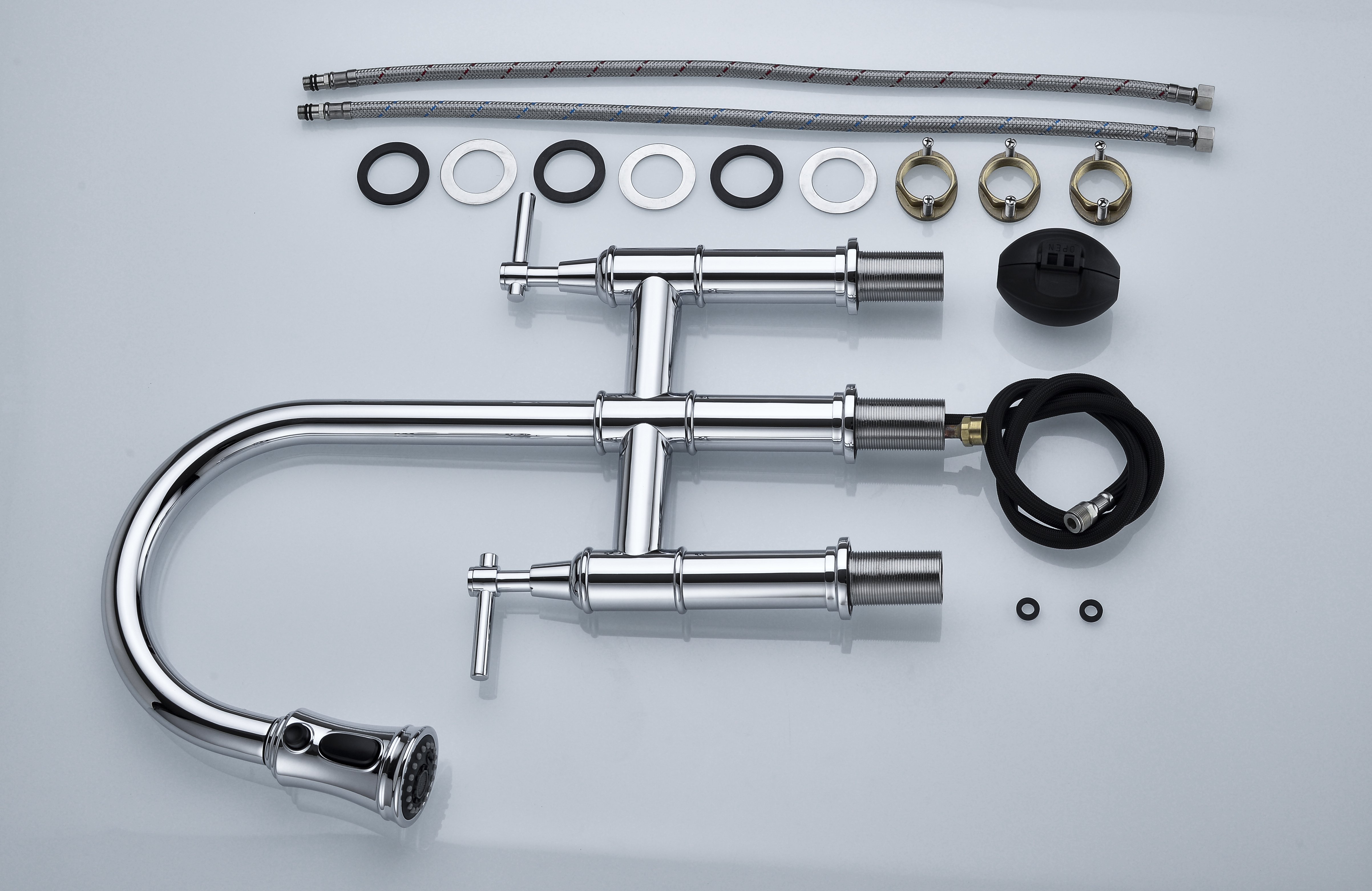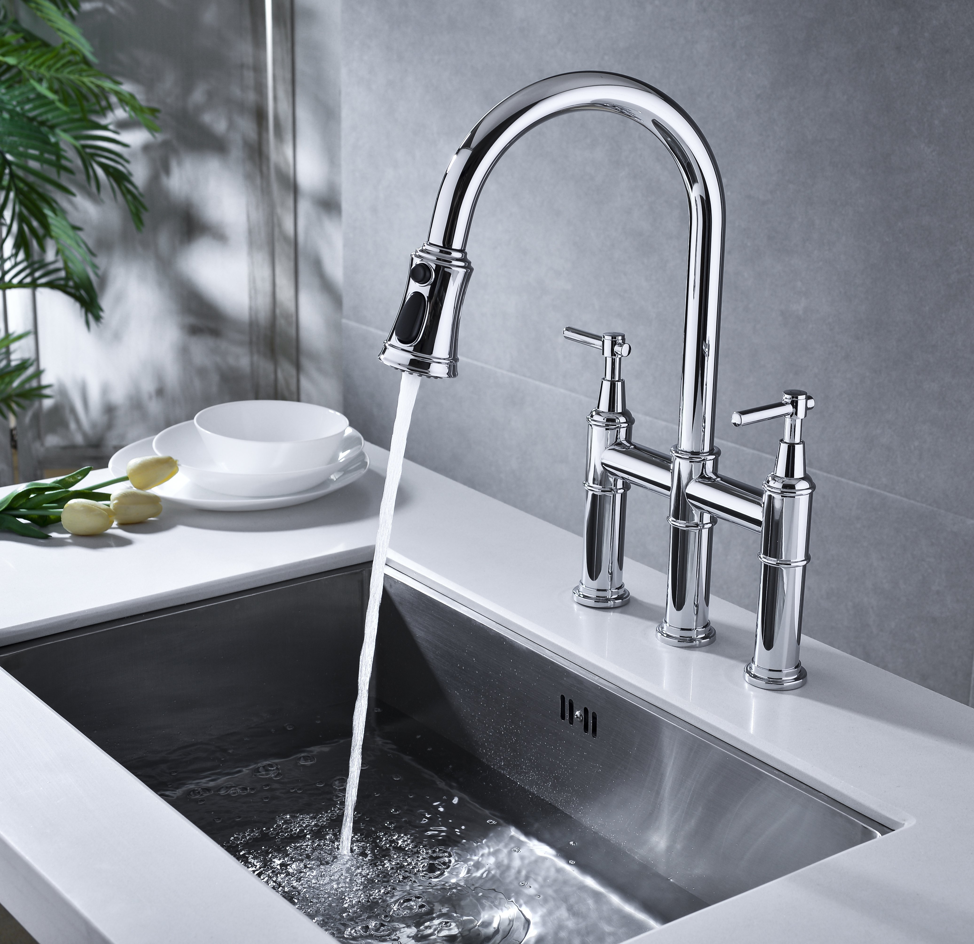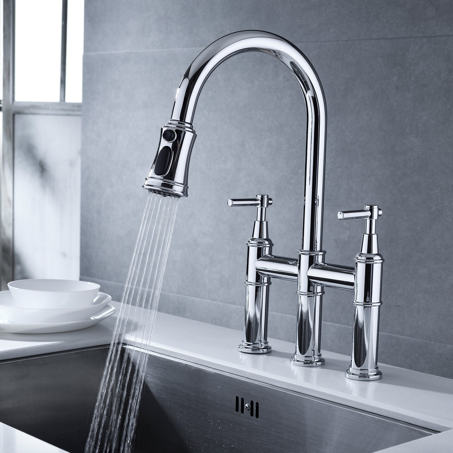 Features:This kitchen faucet corrosion-resistant finish will not fade or tarnish over time; Steel that resists water spots and fingerprints – SOLID BRASS CONSTRUCTION and top of the line components ensure long-lasting leak-free performance.BRIDGE FAUCET DESIGN: Horizontal bar connects hot and cold water handles to the faucet spout for a bold classically-inspired look – PULL-DOWN SPRAYHEAD provides flexibility for up-close tasks and extended reach all around the sink; eliminates the need for a separate side-sprayer.3-FUNCTION FAUCET: Aerated stream and spray for everyday tasks; powerful blade function for heavy-duty rinsing – GOOSENECK SPOUT offers ample clearance for filling tall pitchers; swivels 360 degrees for a broad range of motion.Specifications:Finish:ChromeMaterial : Solid BrassSpout Type:SwivelSprayhead:plasticFaucet Holes :3Number of Handles : 2Overall Height:17.32 inchesSpout Height:9.05 inchesSpout Reach:8.66 inchesFlow Rate:1.8 GPM Net Weight: 6.83poundsGross Weight: 7.72 poundsPackage Dimensions: 24.40x16.73 x2.75 inches