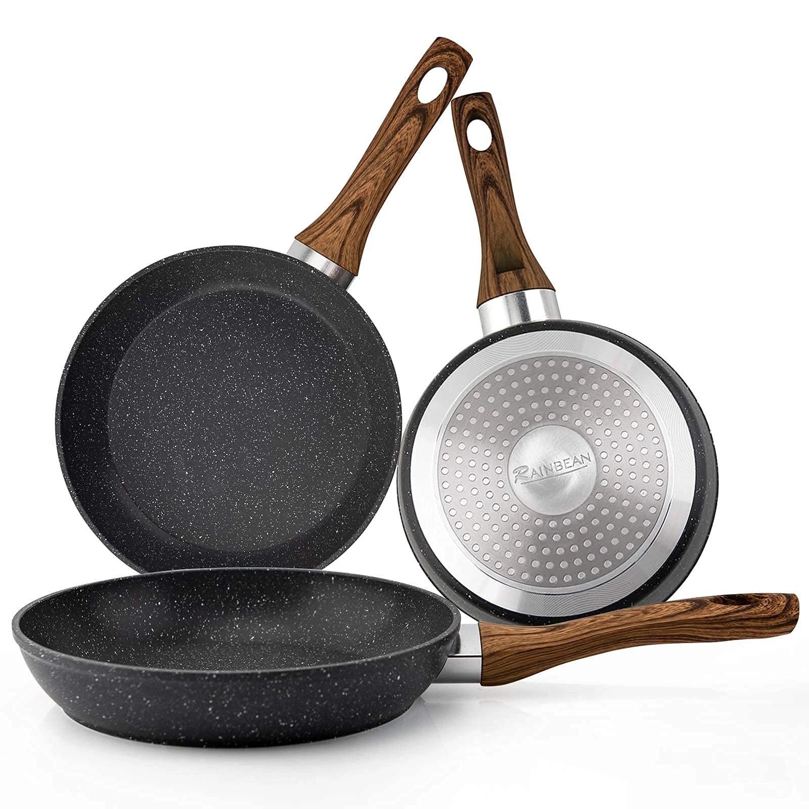 [HIGH QUALITY 3 SET FRYING PAN]: The stone frying pan is made of durable heavy-duty die-cast aluminum and granite coating. Ergonomic Bakelite handle, which keeps you cool and comfortable while cooking