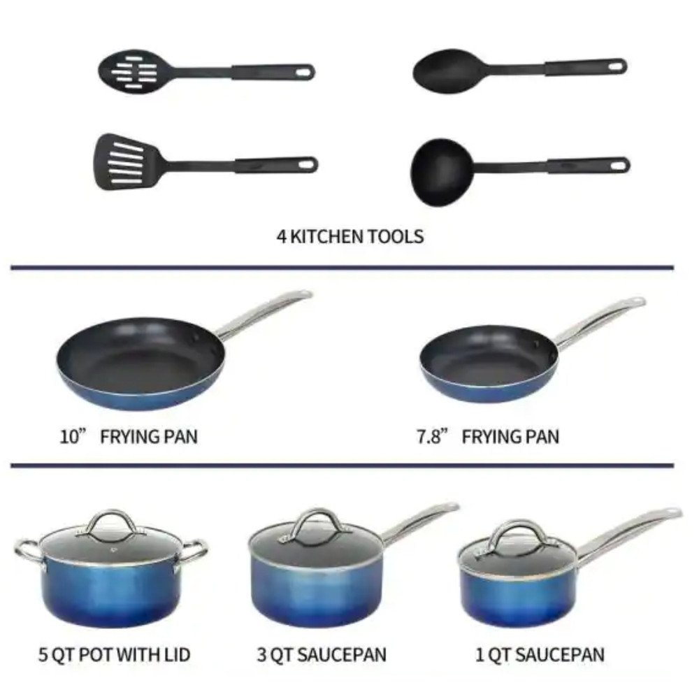 The cookware set consist of 12 pieces including 2 covered stock pots (1qt / 2qt); 2 casserole pots with lid (3qt / 5qt); 8" fry pan; 10" fry pan with lid and a 9.5" steamer insert to provide multiply cooking methods.