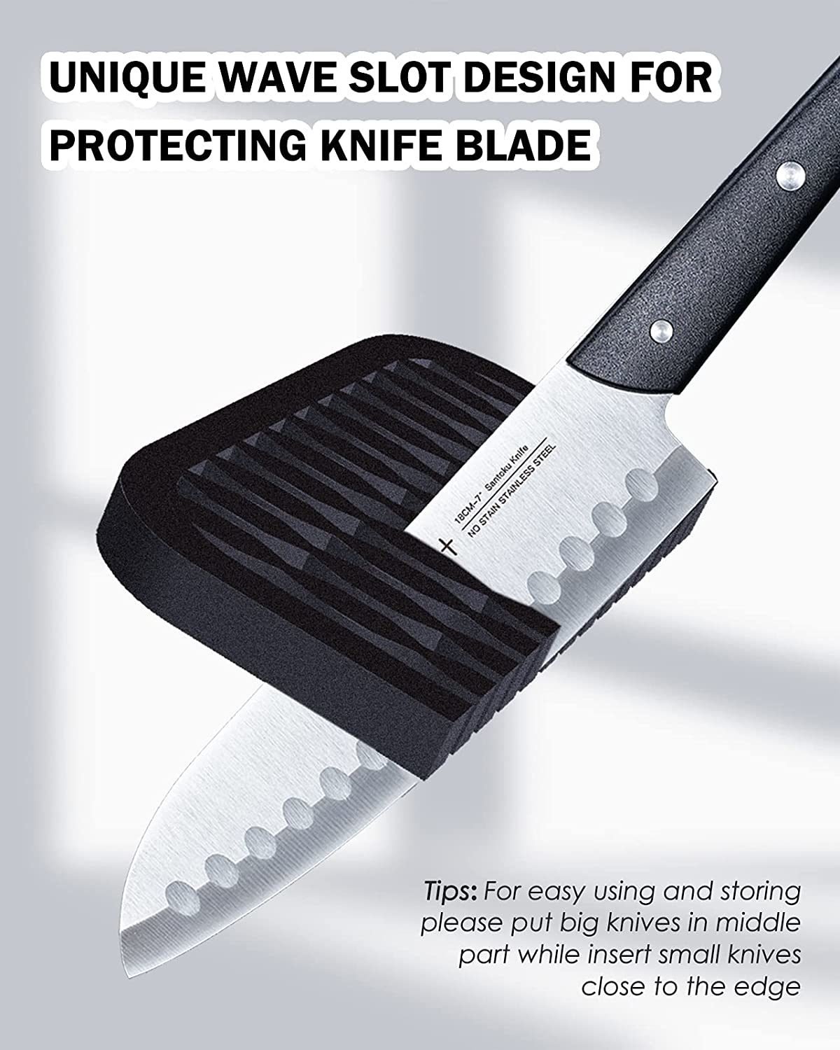 4.Doppelschichtiges Wellen-Design – Küchenmesserhalter ohne Messer-Innenschicht mit Doppel-Riffelschlitz-Design, wodurch der Messerkörper aufrecht stehen kann, ohne zu schütteln und stabil. Selbst wenn der Messerhalter umgedreht wird, fällt das Messer nicht heraus, und Sie können das Messer leicht her