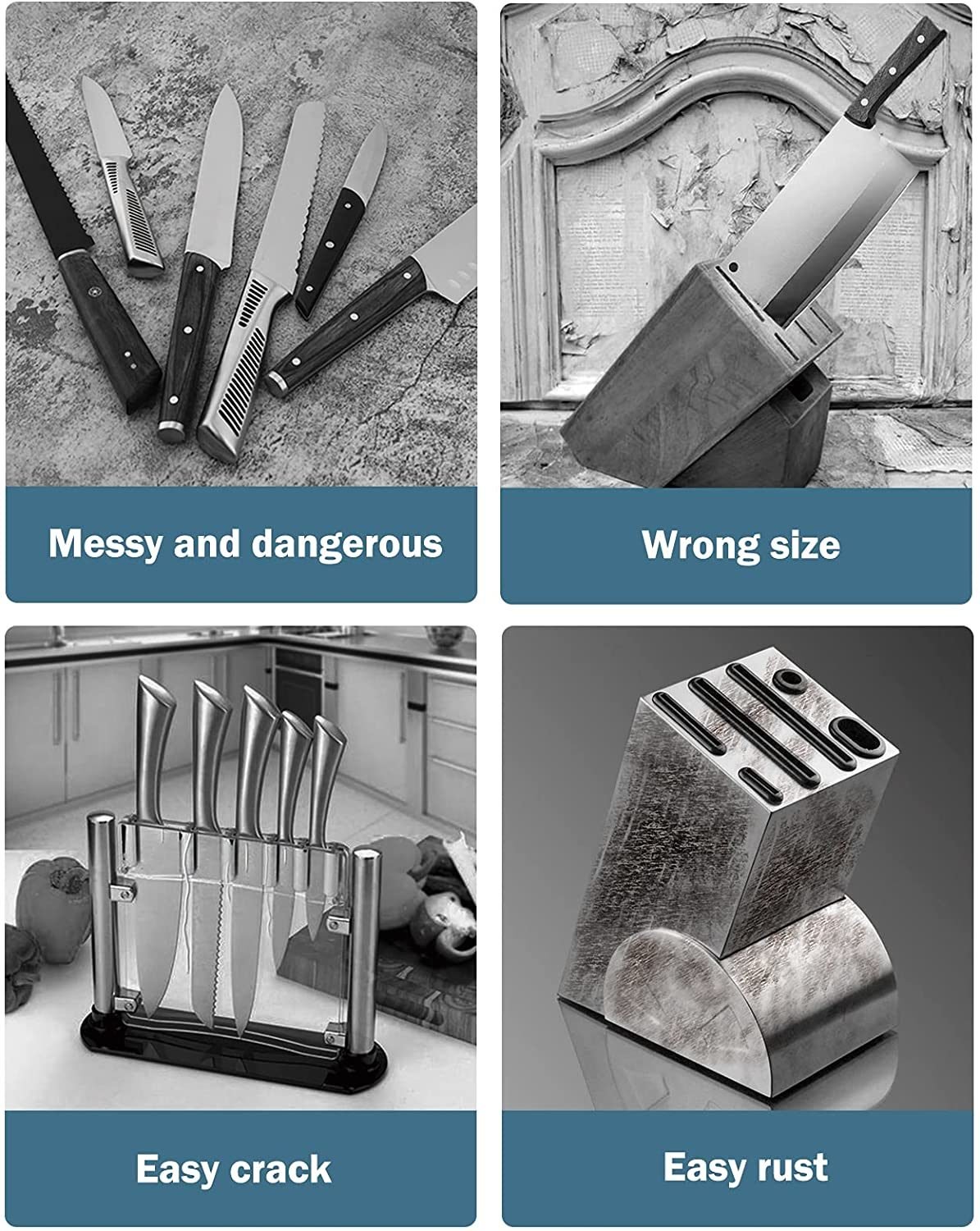 3.Einfache Reinigung und Trocknung – Die Messerhalter-Oberseite ist abnehmbar mit Ablauflöchern, es kann leicht gewaschen und schnell getrocknet werden. Die Gewichtszunahme am Boden erhöht die Stabilität beim Entfernen des Messers und vermeidet Kratzer auf der Theke