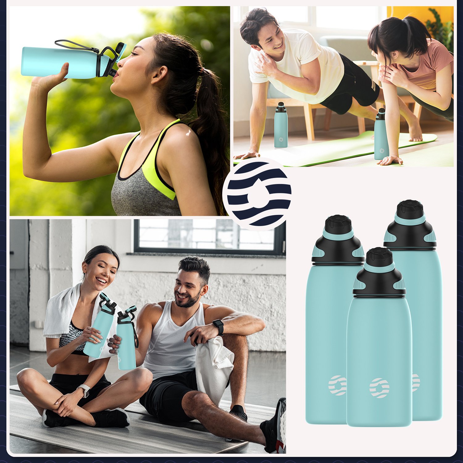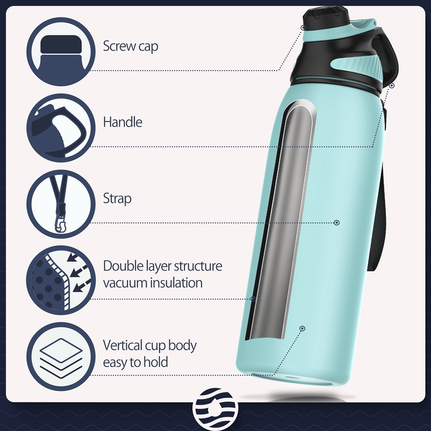 3.Insulated Water Bottle: Made from food-grade stainless steel, our BPA-free water bottle has a double wall design to keep drinks cold plus vacuum insulation & powder coating to keep it sweat-free & easy to grip.