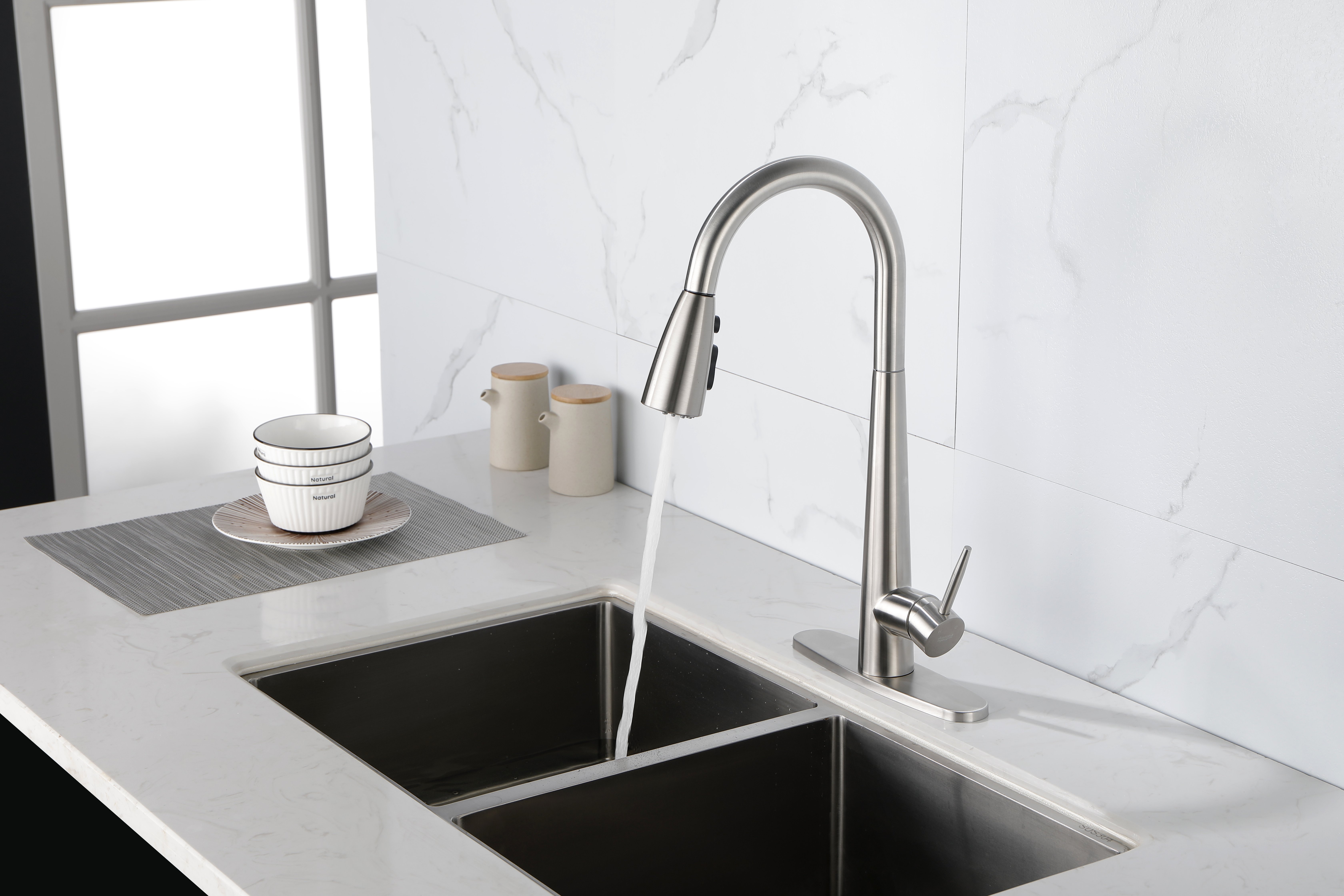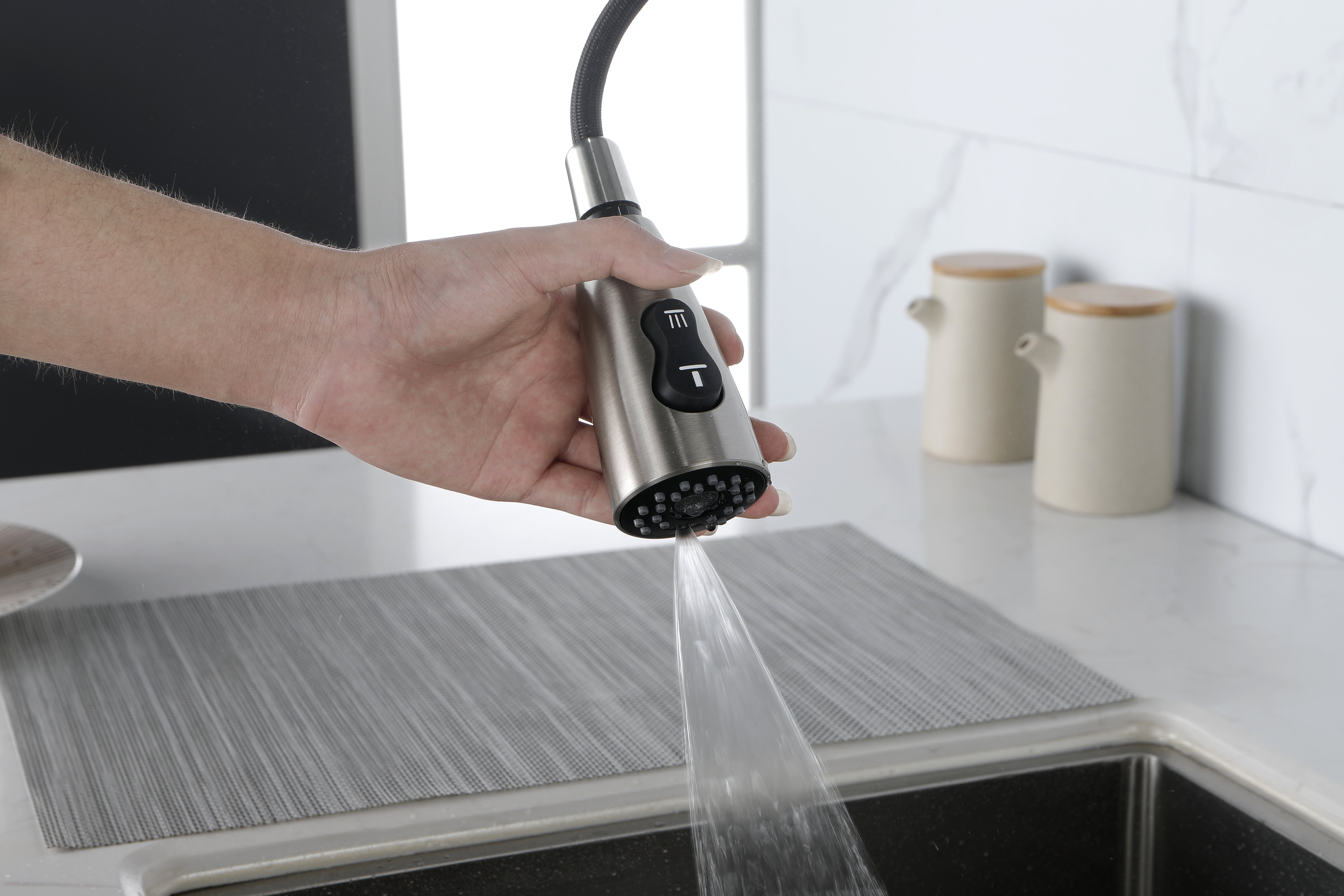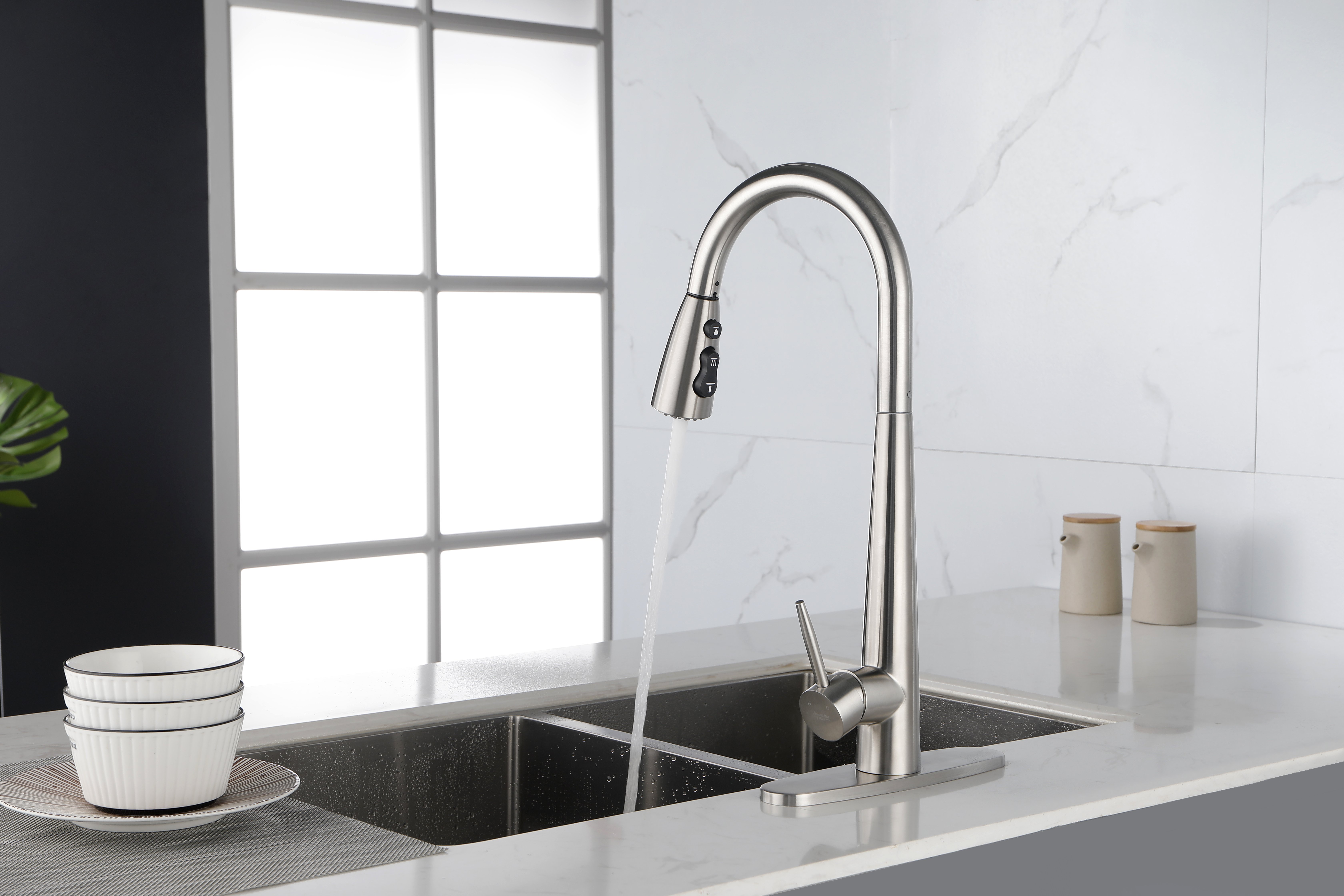 2.Adjust water pressure and temperature with the integrated single handle kitchen faucet, with 3 setting modes (STREAM/ SPRAY/ PAUSE). Multi-layer brushed nickel resists fingerprints and corrosion resistance, high temperature resistant hose. CEC listed. Flow Rate: 1.8 Gallons Per Minute.