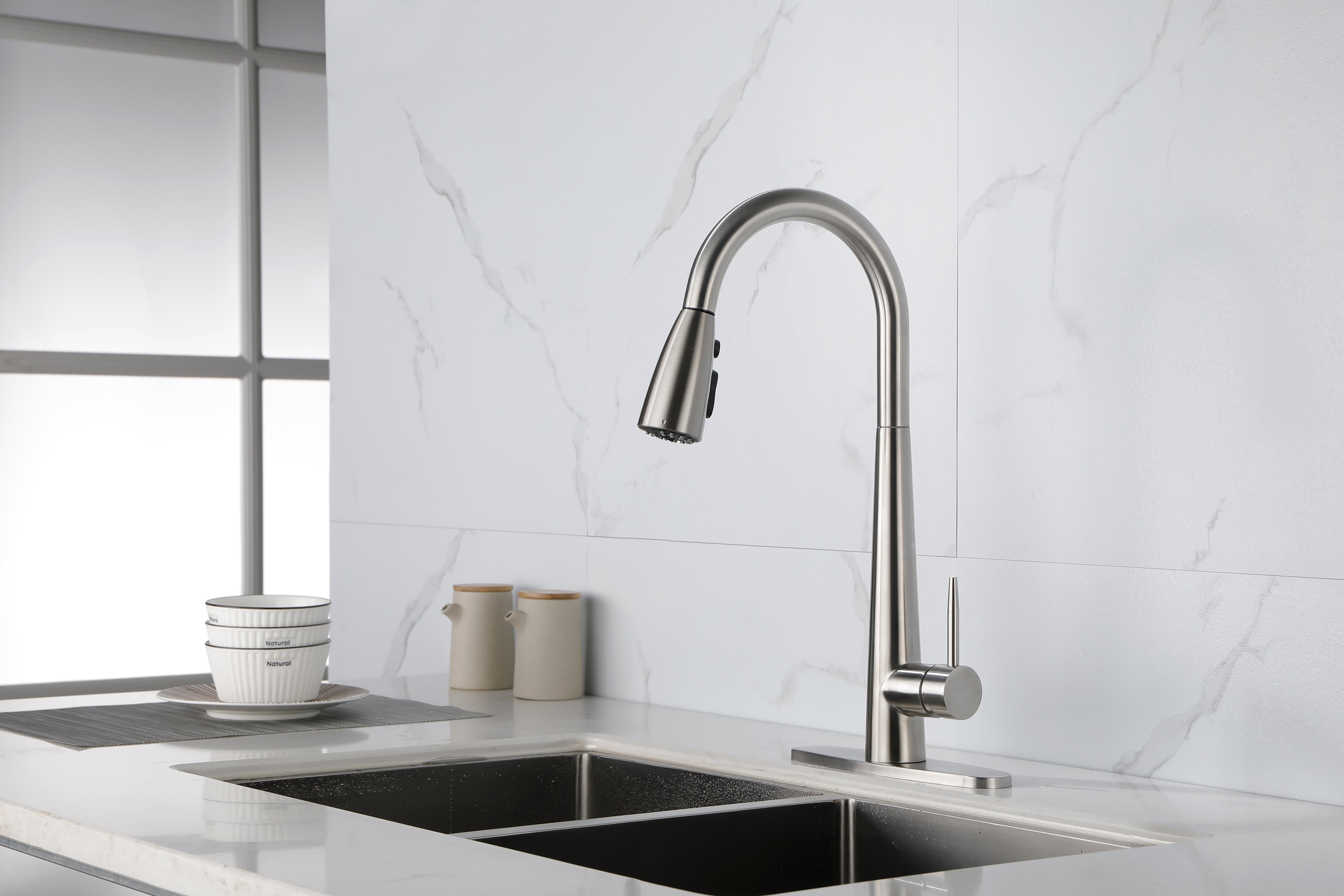 1.Eco-friendly SUS 304 stainless steel pull out kitchen faucets, complied with lead-free regulation, put your family's health first.