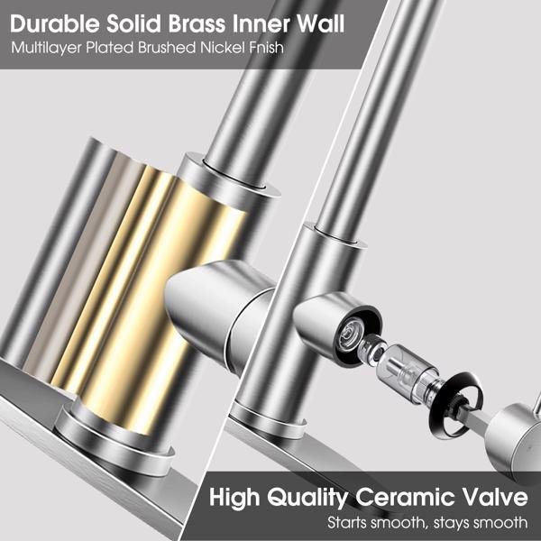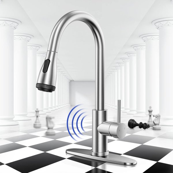 Dual Motion Sensor Function Detection - Pull the faucet head down to automatically eject and release to shut off the water as soon as the spray head is retracted to its original position. Please NOTE to turn on the kitchen faucet handle to launch the infrared motion sensor. This smart automatic design will help prevent you from touching the faucet when your hands are either with soap; stains or dirt.Environmental Friendly Power - Saving Design: The Touchless Kitchen Faucet contains an 180s auto off feature. If you forget to turn off the kitchen sink faucet after using it; it will automatically shut itself down after 180s; and so to achieve the water-saving purpose. Its brushed nickel design is completely lead-free. (Please note: the batteries are excluded).4 Mode Pull Down Kitchen Sprayer - The Kitchen Sink Faucet contains 4 different spraying function: Stream Mode; Spray Mode; Mist Mode; Double Blade Mode. Each mode will satisfy with different applications and you will find this Touchless Kitchen Faucet is a PERFECT helper in dishwashing. Besides; you might pull down the 13.5 inch kitchen sprayer to rinse as most of the kitchen sink area as you wish. The Kitchen Sprayer is replaceable.Easy Installation - With the fast&easy understanding tutorial of this kitchen faucet; its installation only needs less than half an hour to complete the installation and testing. As long as the battery box is hold stably; you will not need to nail the battery box onto the wall.Overall height:17.7"; Spout Height: 8.66"; Spout Reach:8.58"; The Touchless Kitchen Faucet includes a deck plate to cover the extra kitchen faucet holes. Please hang the sensor box to keep it dry. Please avoid the sensor box being wet; which will cause the product's sensing function to fail or reduce the service life.