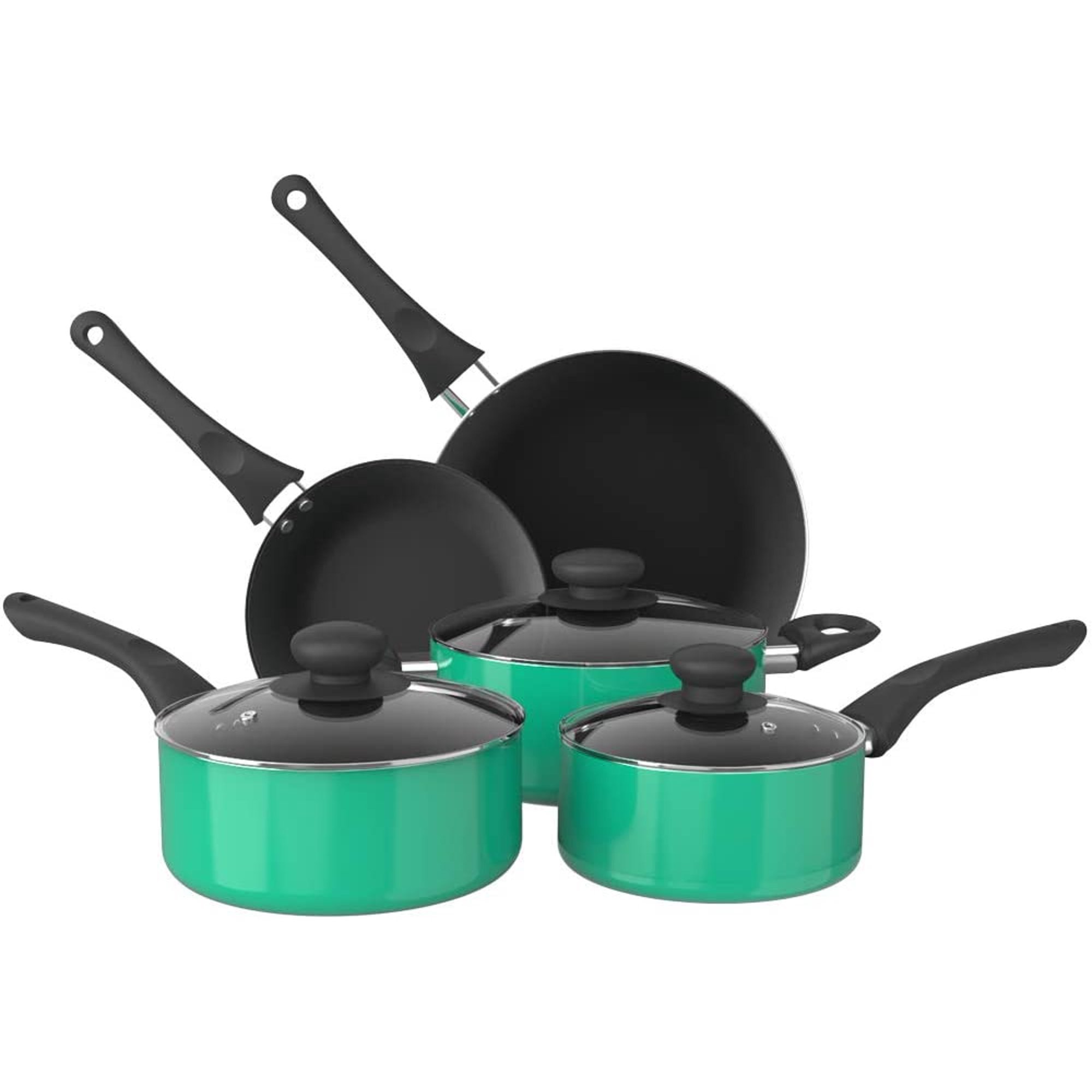 8-piece nonstick cookware set includes 8-inch skillet; 10-inch skillet; 1.5-quart saucepan with lid; 2-quart saucepan with lid; and 3-quart casserole with lid. Make healthy home cooking a habit with this nonstick cookware set. The collection is loaded with everyday essentials including frying pans; sauce pans and casseroles. The handle is designed to keep us cool during use; while also promoting a firm; comfortable hold.