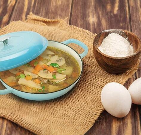 2.Porcelain Enamel Coating: The Cast Iron Braiser features smooth porcelain enamel coating,provides a great heat conductor. And it proven to effectively distribute & retain heat for an even & consistent temperature throughout the entire pot. Excellent for braise, bake, broil, saute, simmer, roast or a