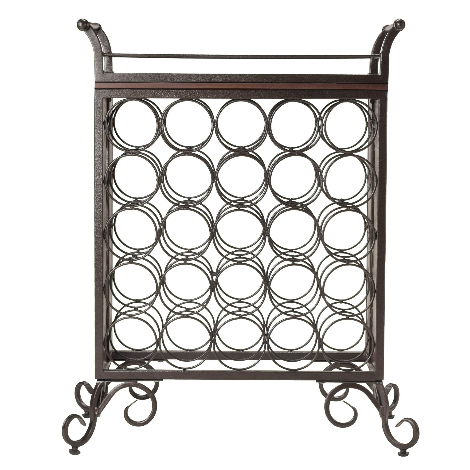 Silvano 5x5 Wine Rack brings class and elagance to your wine storage holding 25 bottles in individual crafted slots with a removable tray made for serving. Its constructed from metal in dark bronze finish and wood for the tray and comes with adjustable feet for uneven floors. The removable tray is 23.1"W x 10.3"D x 5"H with a serving surface of 19.25"W x 6.9"D. Each wine holder slot has a diameter of 3.5". The overall assembled size of the wine rack is 25.8"W x 13.5"D x 30.1"H. Made with combination of composite wood plus veneer, metal frame and wrought iron. Assembly required.Overall wine rack size is 25.8"W x 13.5"D x 30.1"H.Removable tray with handle size is 23.1"W x 10.3"D x 5"D. Tray serving surface is 19.25"W X 7"\D.Made with composite wood plus veneer, metal frame and wrought iron. Assembly required.nullnullnull This product meets the oversized requirement per UPS/FedEx. The shipping weight reflected is the dimensional weight. This product also meets the large package requirement per UPS/FedEx. The estimated shipping cost will include this fee. Large package is $70.00, applied when length plus girth [(2 x width) + (2 x height)] combined exceeds 130 inches. Additional Handling charge of $10.50 applied where a package's longest side exceeds 48 inches in length, the second longest side exceeds 30 inches in length, or total weight is greater than 70 lbs.This product meets the oversized requirement per UPS/FedEx. The shipping weight reflected is the dimensional weight. This product also meets the large package requirement per UPS/FedEx. The estimated shipping cost will include this fee. Large package is $70.00, applied when length plus girth [(2 x width) + (2 x height)] combined exceeds 130 inches. Additional Handling charge of $10.50 applied where a package's longest side exceeds 48 inches in length, the second longest side exceeds 30 inches in length, or total weight is greater than 70 lbs.